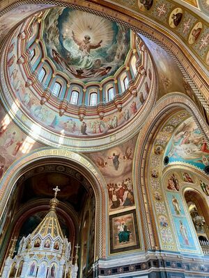 Например, в интерьерах Храма Христа Спасителя К. А. Тон использует множество световых проёмов в купольной зоне. Несмотря на массивность здания, свет распределён таким образом, что верхняя часть интерьера кажется более лёгкой и «открытой», что напоминает византийское стремление подчеркнуть вертикальную ось светом, а не только архитектурой.