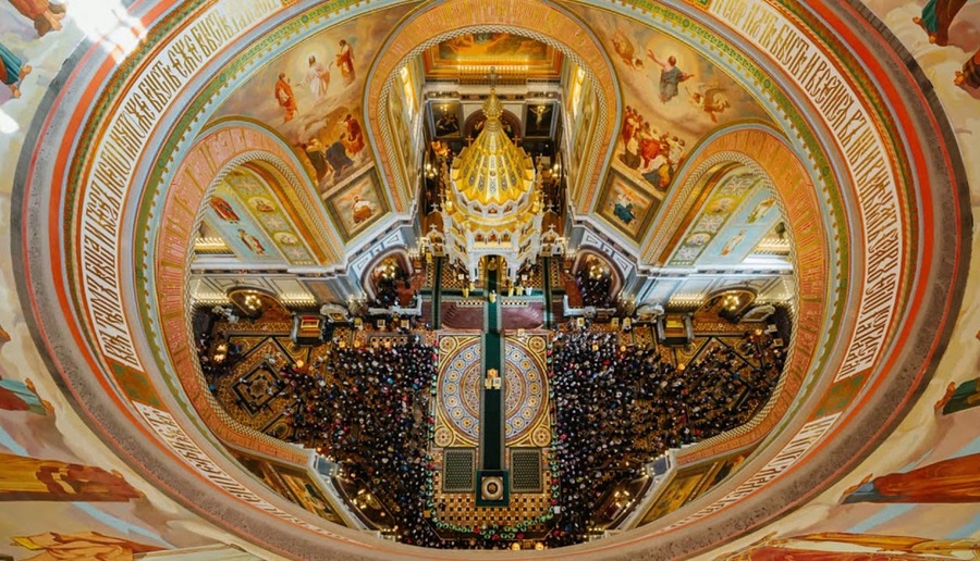 Приём концентрации взгляда под купольной зоной усиливается использованием световых эффектов, традиционных для византийской архитектуры.