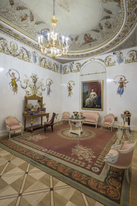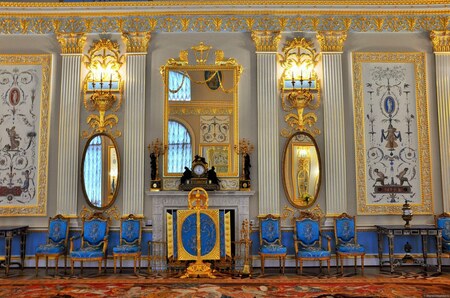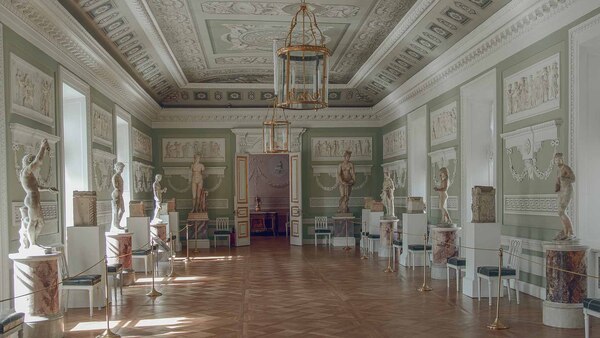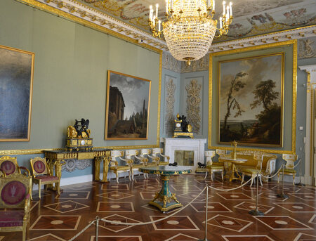 Голубой зал Павловского дворца, Павловск // Бежевая гостиная Мраморного дворца, Санкт-Петербург.