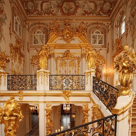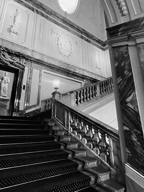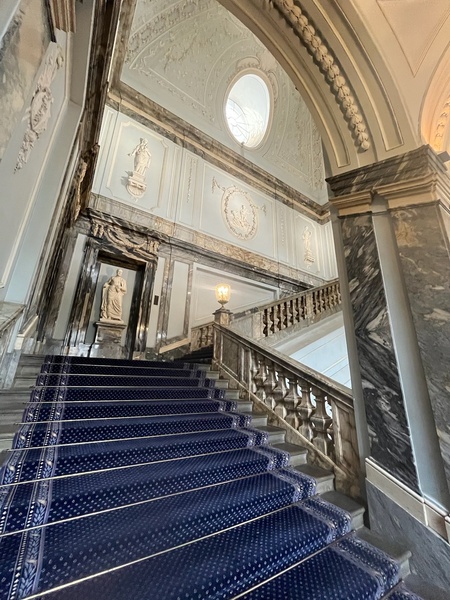 Симметрия проявлялась в зеркальном повторении сторон, как, например, в Парадной лестнице Мраморного дворца, где два марша расходятся слева и справа от центрального зала, создавая визуальный баланс.