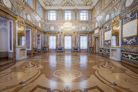 В мраморе оформлялись полы, лестницы и колонны. Например, в Мраморном дворце Санкт-Петербурга пол из разноцветного мрамора создаёт геометрические узоры, которые повторяют композиционные линии потолка и фризов, усиливая восприятие симметрии и ритма.