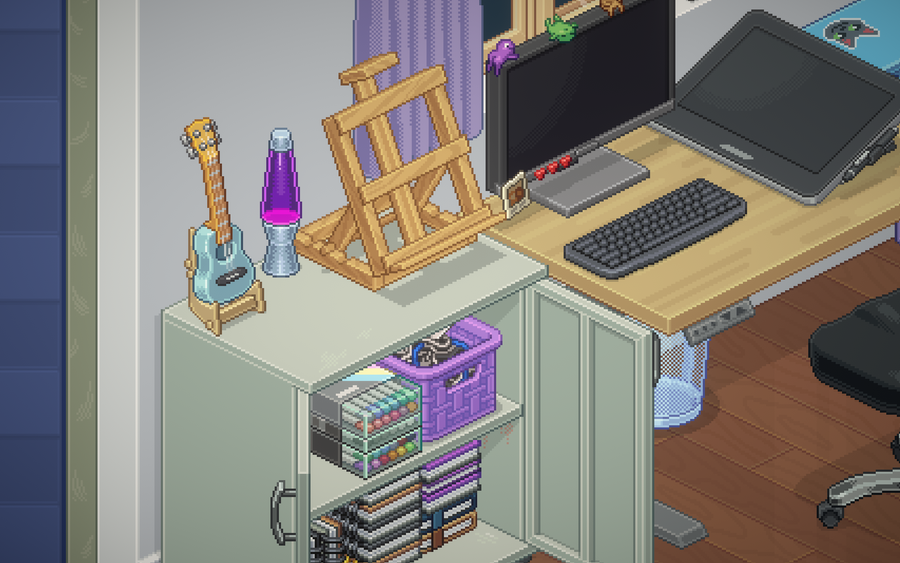 Комфорт можно оценить на примере специальной пробковой доски для эскизов её персонажей, тесно соседсвующими с её наградами, чтобы напоминать на каком этапе она сейчас и чего уже достигла. Или смотря на комод для всех её скетчбуков и арт-материалов.