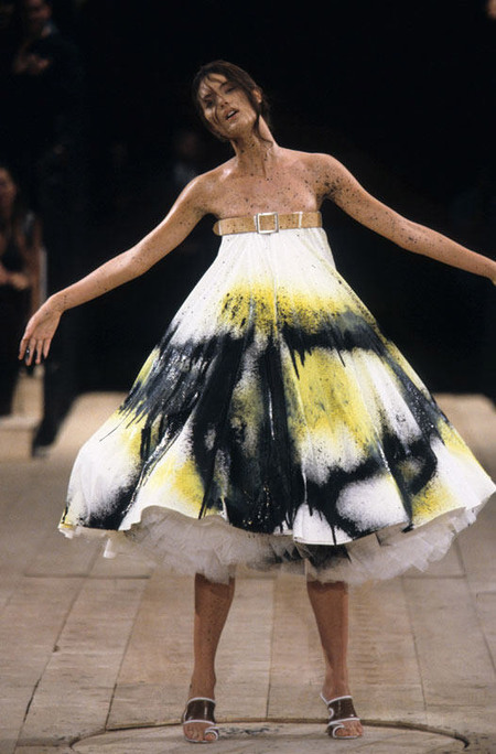 Одним из знаковых модных перфомансов можно считать показ коллекции SS 1999 дизайнера Александра Маккуина. В нем автор поднимает вопрос о механизации труда и о напряжении конфликта с ручным трудом. В рамках этого перформанса стоит также отметить его телесную составляющую. Моделью выступила Шалом Харлоу, в прошлом балерина, что указывает на ее высокий уровень владения телом и его экспрессивными возможностями. Ее реакция на краску (дрожь, колебание, повороты) добавили эмоциональность этому перформансу.