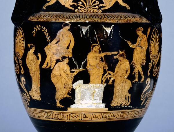 Аполлон защищает Ореста от Эриний | Деталь росписи апулийского кратера с волютами из Руво | Около 370 года до н. э