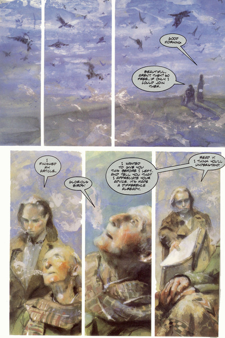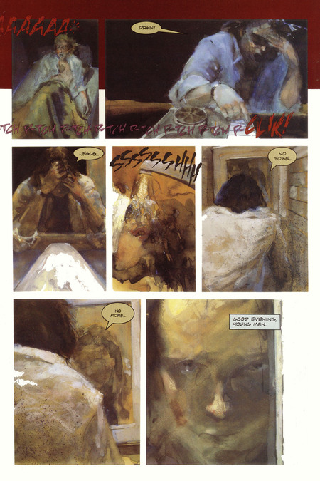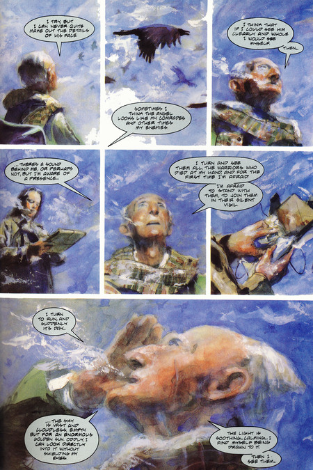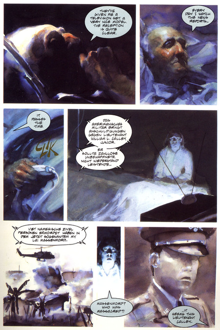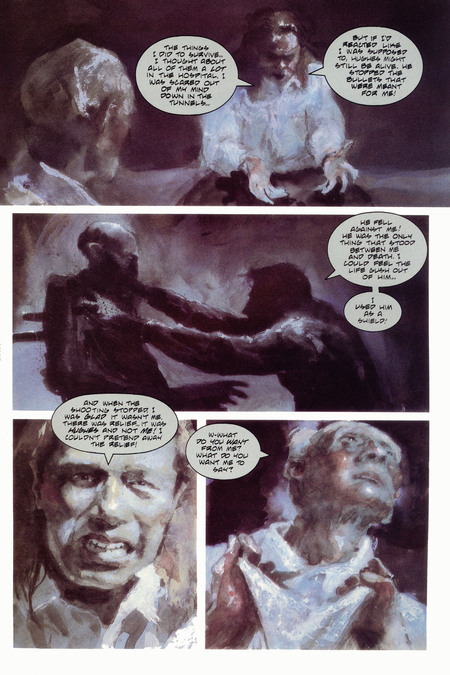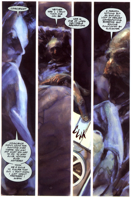 В ранее упомянутом «Enemy Ace: War Idyll» на многих фреймах лицо героя кажется отлитым из измученного металла: Пратт использует мазки охры, землистого коричневого и кроваво-рыжего тонов. Наслаивая краску полупрозрачными мазками, художник вылепливает форму, придавая лицу текстурности и металличности.