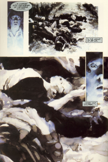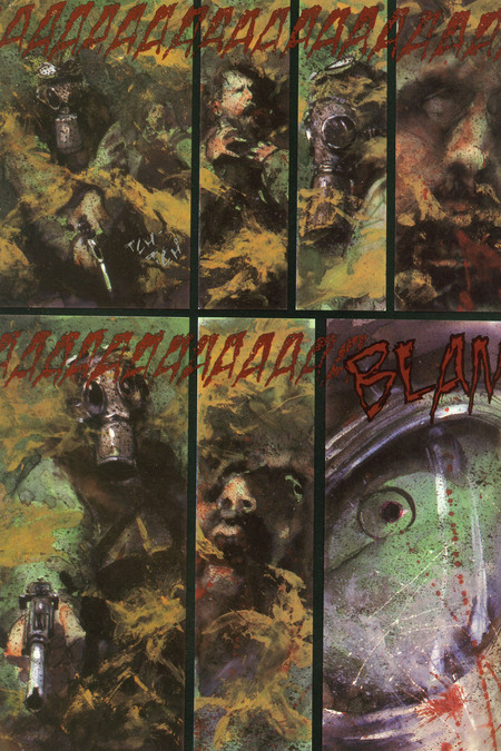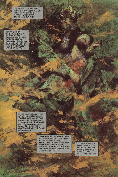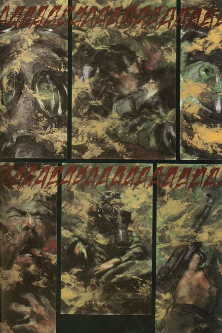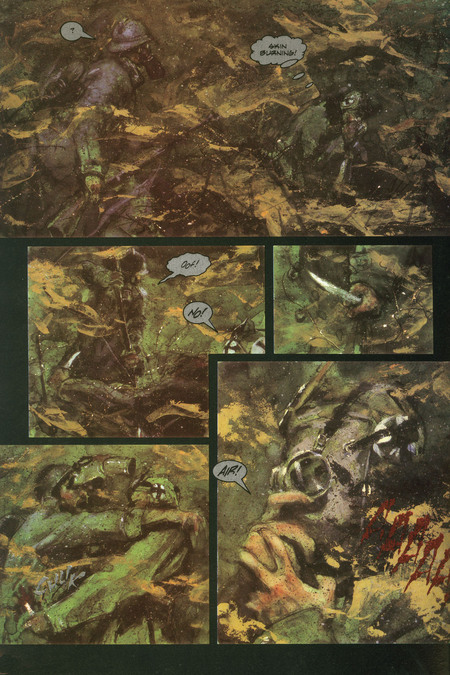 Характерный пример — фреймы из «Enemy Ace: War Idyll», где фигуры солдат почти не отделены от военного ландшафта. Силуэты людей растворяются в клубах грязи и дыма: Пратт соединяет фигуру с окружающим хаосом с помощью широких размазанных мазков и туманной цветовой гаммы. Фигура как будто создана из того же материала, что и дымящаяся земля. Контур тела размывается, исчезает, пока персонаж не превращается в элемент разрушенного пространства — тело и пейзаж переживают одно и то же состояние истирания.