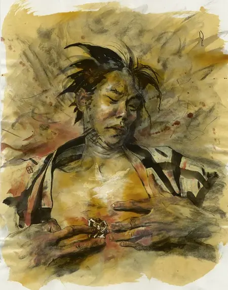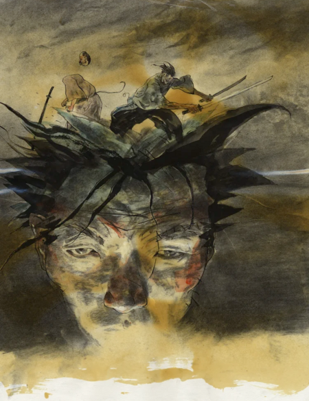 Один из ярких примеров — полноценная страничная иллюстрация с изображением лежащего героя. Мягкие размывы, перетекающие пятна и многослойные акварельные заливки создают впечатление, что персонаж не лежит на поверхности, а словно возникает из неё, являясь её же продолжением: складки ткани переходят в тени, тени — в неопределённые клубящиеся формы, и только едва намеченные формы лица указывают на человеческое присутствие. Такое визуальное решение стирает традиционное различение между телом и средой, предлагая рассматривать человека как включённый в поток обособленного пространства элемент.