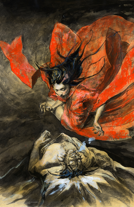 Цветовое решение строится на столкновении двух аспектов: глубокие тёмные, почти чернильные синие и коричневые и агрессивные, вспыхивающие красные и золотисто-жёлтые оттенки. Этот контраст создаёт ощущение эмоционального вектора: от подавленного, внутренне замкнутого состояния, к вспышке боли и кульминации.