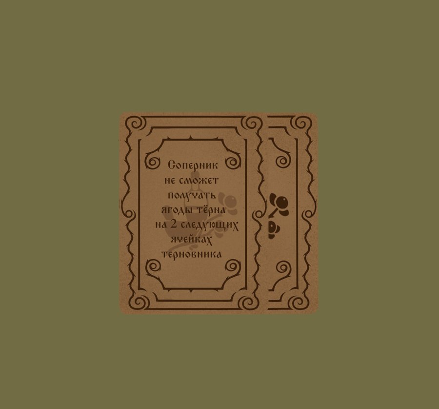Настольная соревновательная игра для двоих, где каждый из игроков стремится собрать колоду карт с наибольшим количеством очков. Вам предстоит перемещаться по зарослям терновника, выполнять цели раундов, а также тратить ягоды тëрна, чтобы получать и прокачивать карты.