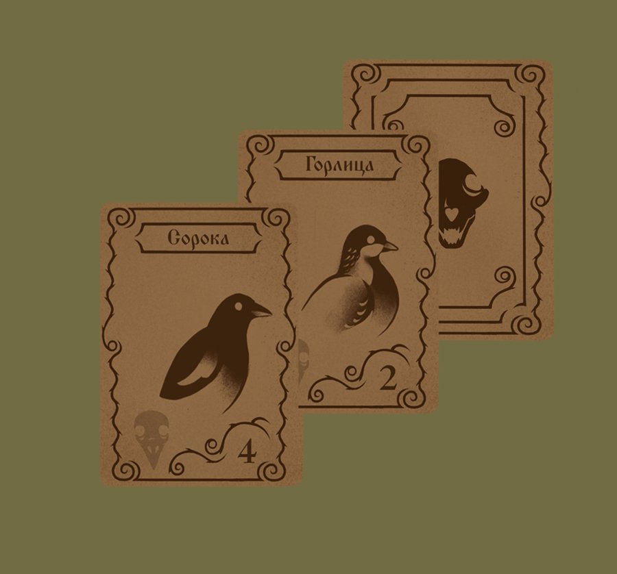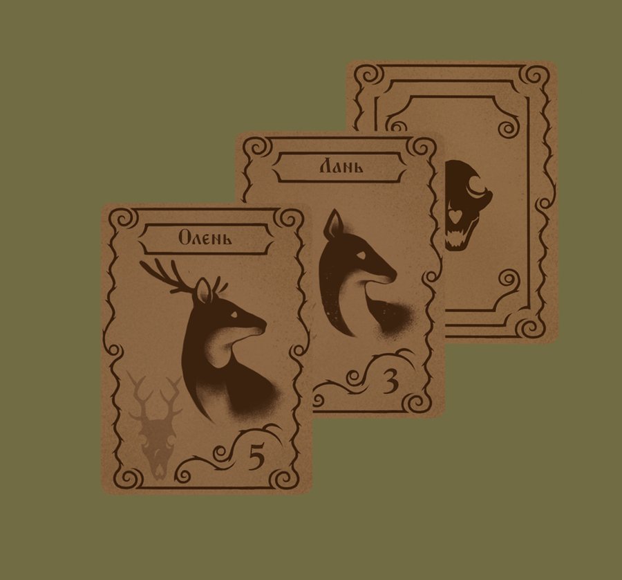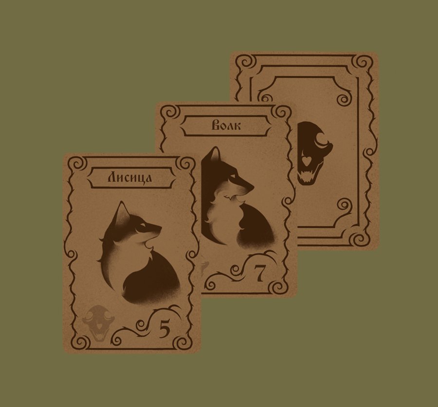 Карты зверей делятся на 3 масти: • Псовые (волк, лисица) — 8 карт; • Птичьи (сорока, горлица) — 16 карт; • Парнокопытные (олень, лань) — 12 карт.