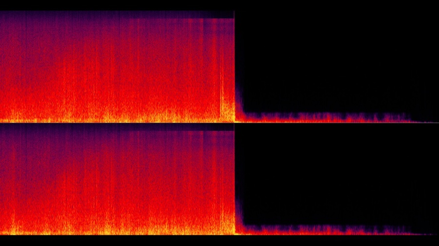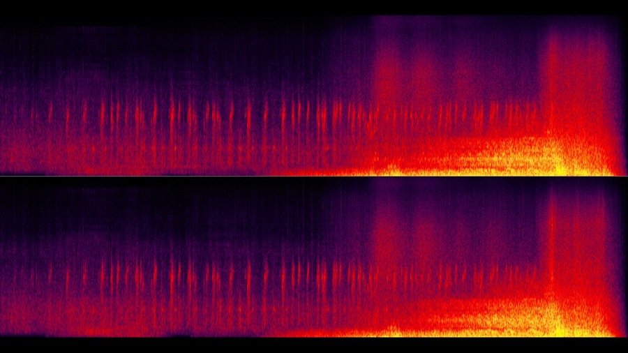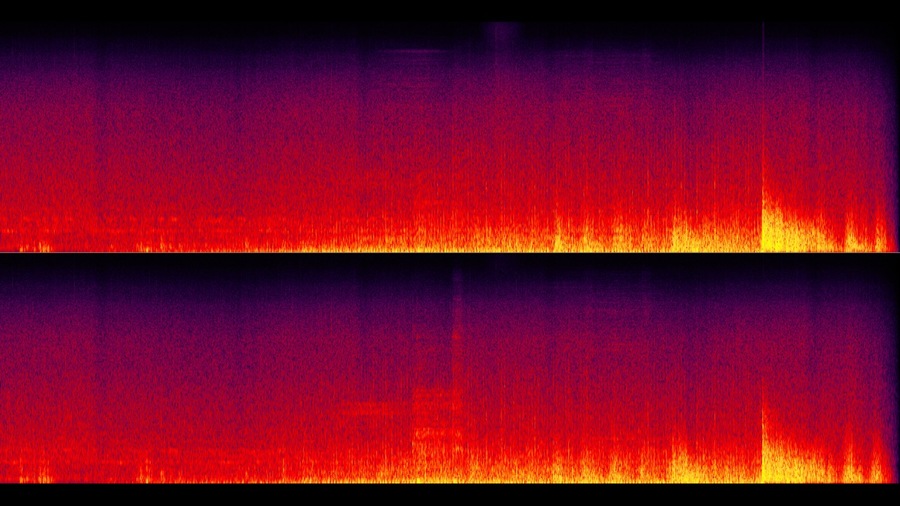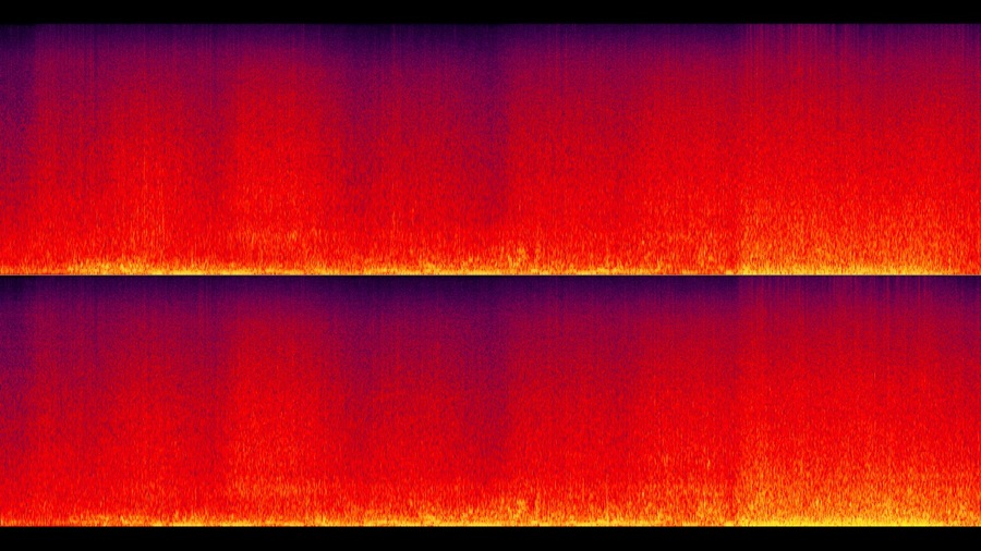 Постепенно начинают проявляться биоакустические звуки: быстрые трели (rapid warbles) птиц, резкие фонемные сигналы насекомых, тяжёлые низкочастотные шелесты ящериц. В спектре появляются множественные переходные процессы, хаотические, но формирующие целостную акустическую ткань. Город становится слышимым как живое, органическое тело, в котором природа находится в непрерывном диалоге с архитектурой. Однако затем происходит резкое падение уровня всех сигналов — пороговое смещение (threshold shift). Звуки исчезают почти одновременно.