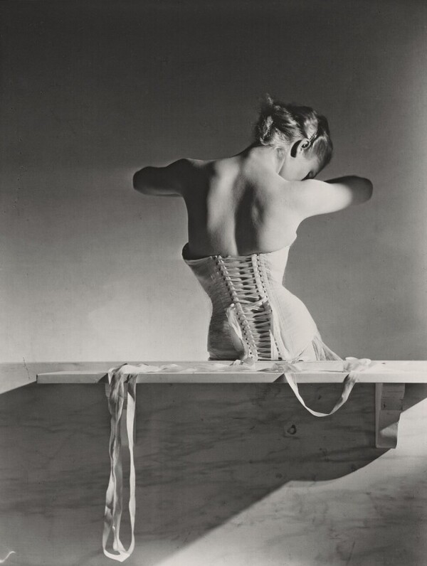 Корсет здесь является центральным персонажем драмы. Шнуровка, которую мы видим, — это совсем не бытовой процесс одевания, а сам корсет, с его сложной конструкцией и шнуровкой, исторически связан с церемониалом, с подготовкой к выходу в свет. Освещение тоже несет определенный смысл — Хорст акцентирует внимание на силуэт, подчеркивая мышцы на спине, рельефы и создавая ощущение таинственности. Образ добавляет снимку сюжетность — мы можем представить, что за кадром стоит человек, только что помогавший девушке со шнуровкой корсета, или как модель вот-вот начнет одеваться. Это финальная сцена, где героиня остается наедине со своими мыслями, а зритель становится свидетелем интимного момента.