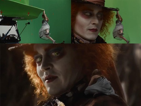 Похожий принцип используется и в сцене допроса Красной королевой слуг-лягушек. На съёмочной площадке Хелена Бонем Картер разговаривала не с готовыми персонажами, а с неподвижными зелёными статуями. Они служили маркерами для правильного направления взгляда и опорой для мизансцены. Впоследствии статуи заменялись анимированными CG-лягушками. В результате зритель видит законченную сцену с персонажами, которых физически никогда не было в павильоне, но взаимодействие по линии взглядов и ритм сцены остаются «живыми» и убедительными.