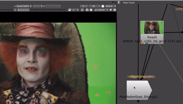 Помимо головы, в кадре изменяются и глаза персонажей. Во время постпроизводства команда визуальных эффектов слегка увеличила глаза не только Красной королевы, но и Безумного Шляпника. Хотя изменение не столь радикально, оно сильно влияет на общее впечатление: взгляд становится более «кукольным», а выражение лица чуть чрезмерным, что усиливает ощущение сюрреалистичности происходящего.