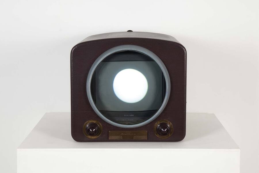 Инсталляция Нам Джун Пайка «Moon is the Oldest TV», состоящая из двенадцати телевизоров, выстроенных в ряд, на первый взгляд провоцирует зрителя на медитативное созерцание. В полуосвещенном пространстве на экранах возникают образы, которые поначалу воспринимаются как документальные снимки Луны в различных фазах. Эта первоначальная иллюзия достоверности тонко манипулирует восприятием, заставляя аудиторию доверять телевизионному изображению как источнику объективной реальности.