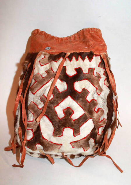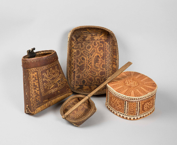 Сумки из кожи и бересты, которые использовались для хранения мелких предметов или амулетов, украшались родовыми знаками. Эти орнаменты показывали принадлежность к определённой семье или роду и отражали связь человека с традициями предков. На них часто присутствовали мотивы звериных следов, птиц или стилизованных природных форм — элементы, которые должны были приносить удачу в промысле и защищать владельца.