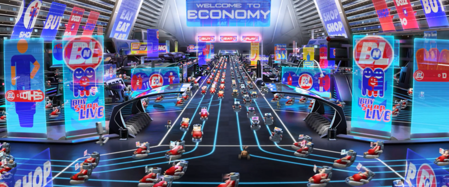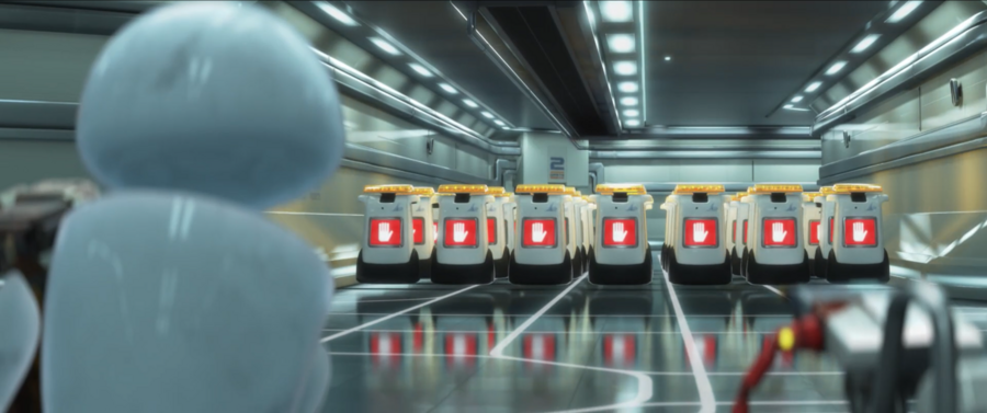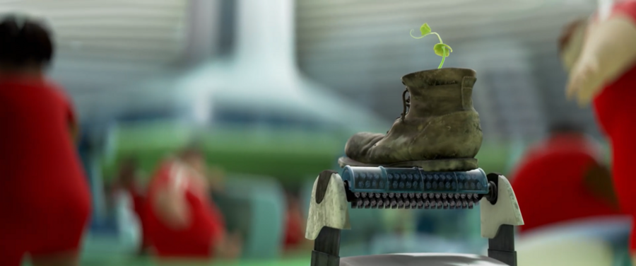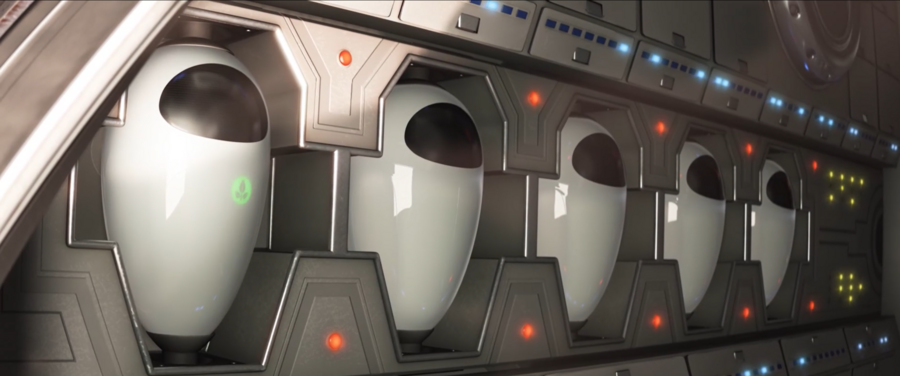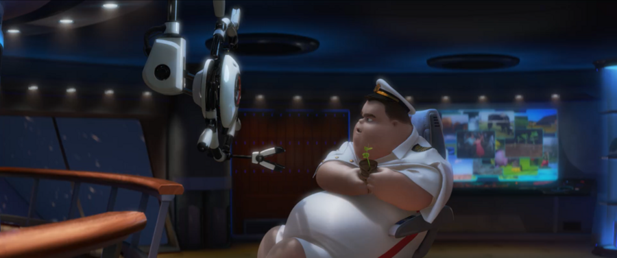 Так, в мультфильме «ВАЛЛ-И» искусственная, стерильная среда противопоставляется живой природе с помощью цветовой палитры: холодные бело-голубые оттенки внутри космического корабля «Аксиома» и пыльная желто-оранжевая поверхность Земли. Обитающие в космосе люди, однако, выглядят нарочито комично: как надутые шарики, даже не достающие до пола ногами. С помощью такого простого и понятного образа публика приходит к выводу о том, насколько сильно человечество деградировало физически за время пребывания вдали от родного дома.