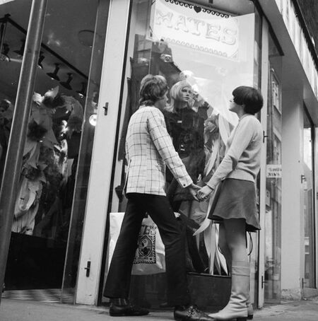 Особенность лондонского контекста в том, что граница между улицей и магазином, между самодеятельным стилем и коммерческим предложением оказывается очень тонкой. Независимые бутики, такие как Bazaar Мэри Куант или Biba, расположены в шаговой доступности от улиц, где концентрируется молодёжь. Их витрины ориентированы на прохожих: манекены в мини‑платьях стоят почти у самого стекла, вывески и интерьерная графика подчёркивают ощущение непосредственности. В отличие от традиционных «дамских» салонов, рассчитанных на состоятельную клиентуру и демонстрирующих одежду в полудомашней, полусалонной обстановке, лондонские бутики 1960‑х годов напоминают клубы, куда заходит молодёжь — не только за покупками, но и за впечатлениями.