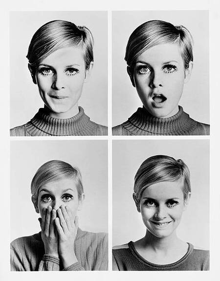 Лица моделей подстраиваются под логику мини‑силуэта. Короткие стрижки, большие глаза, подчеркнутые стрелками и густыми ресницами, минималистичный макияж губ усиливают впечатление подростковости. Твигги с её худощавой фигурой, огромными глазами и короткими волосами становится почти идеальным воплощением мини‑образа: её тело и лицо легко узнаются даже в сильно стилизованных изображениях.