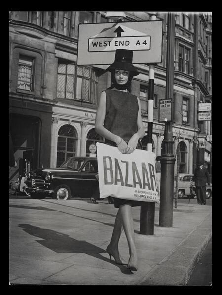 Магазин Bazaar Мэри Куант на Кингс‑роуд. Лондон, 1960‑е годы; Модель с сумкой магазина Bazaar, бутика Мэри Куант на Кингс‑роуд. Ок. 1959 года.