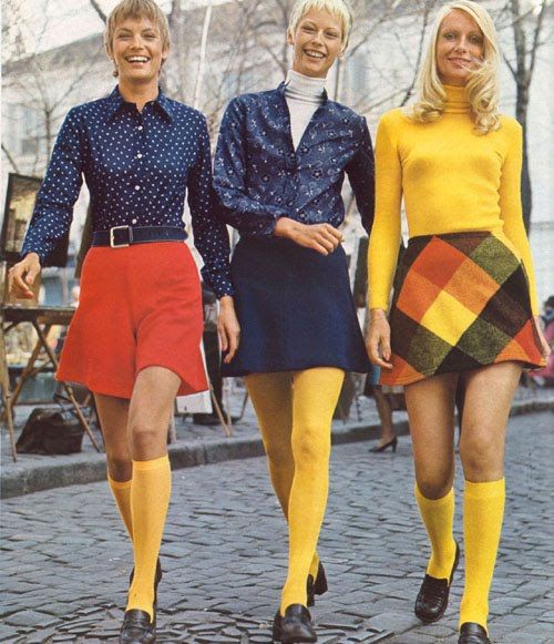 Девушки в мини‑юбках и ярких цветных колготках на городской улице. Ок. 1960‑е годы; Девушки в мини‑юбках и ярких цветных колготках на прогулке за городом. Ок. 1960‑е годы.