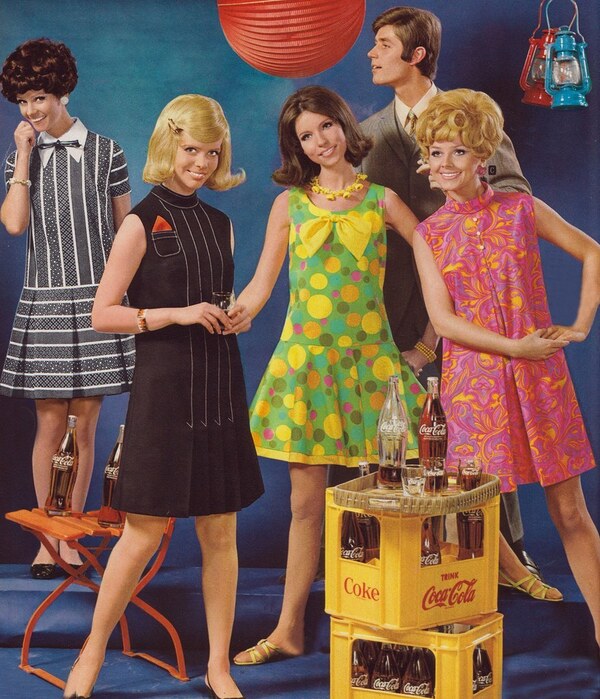 Рекламные изображения мини‑юбок 1968–1974 годов; Модели демонстрируют мини‑плать. Ок. конец 1960‑х годов.