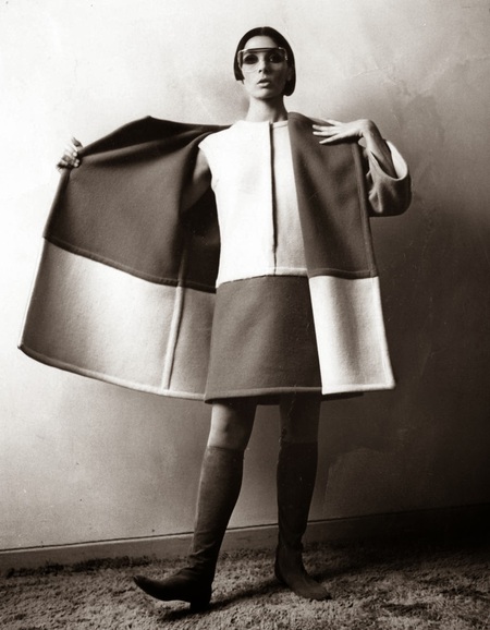 Не менее важна верхняя одежда. Длина пальто и плащей подстраивается под мини: слишком длинное пальто, закрывающее колени, разрушает новый силуэт, скрывая основную зону визуального акцента. Поэтому в моду входят укороченные пальто и плащи до середины бедра или чуть ниже. В сочетании с мини они создают характерный «двухэтажный» силуэт: верхний блок — графичный, цельный, нижний — ноги, выделенные цветом и фактурой колгот и обуви.