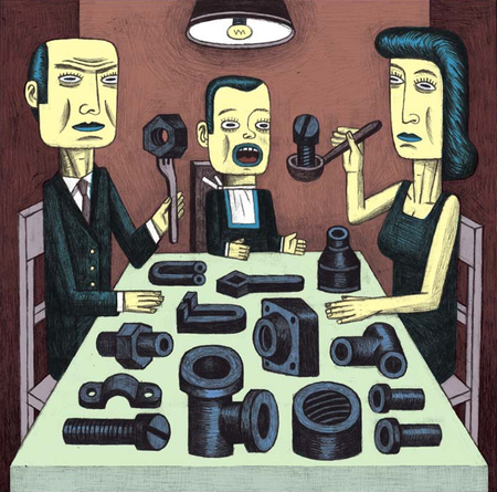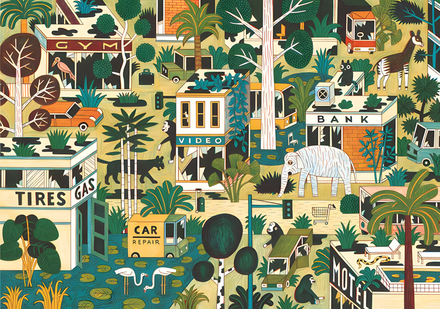 Иллюстрации Хеннинга Вагенбрета всегда наполнены сюжетом — часто это абсурдистские черные комедии, происходящие на фоне масштабных происшествий.