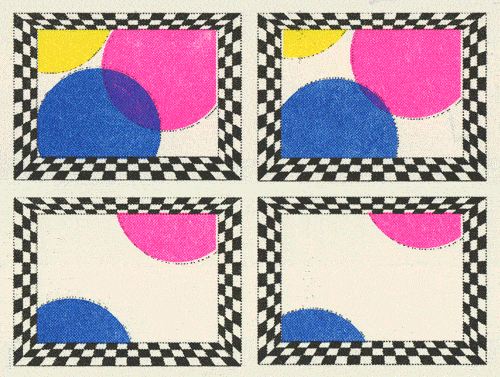 Наложение комплементарных цветов создает полутона. Принты «Вертолеты», 2016 // Ризографическая анимация, Джулиа Шимауц