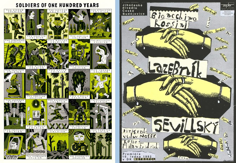 Постер «Солдаты последних ста лет», 2014 // Афиша к опере «Севильский цирюльник» в Южночешском театре, Иржи Шаламоун, 1992 // «Ночная сцена», Иштван Фаркаш, 1934