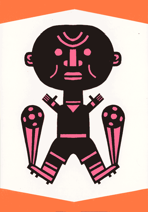 Художник также экспериментирует с симметрией — серии принтов и книга основаны на вырезках из бумаги. Такая техника позволяет иллюстратору создавать яркие образы, основанные на контрастах — в сочетании с серьезной мимикой и несуразной позой персонаж вызывает смех.