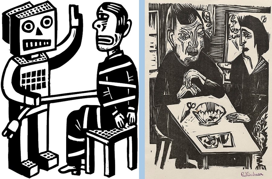 Иллюстрация для The New York Times «Компьютерный террор», 1994 // «Старуха и молодая», Эрнст Людвиг Кирхнер, 1921 // «Обезьяны и люди» 2009