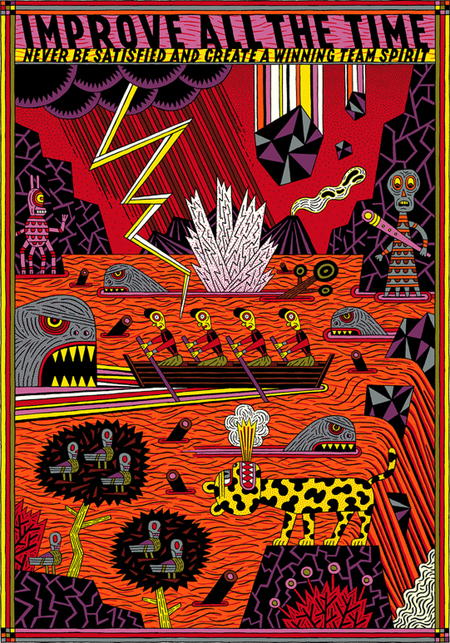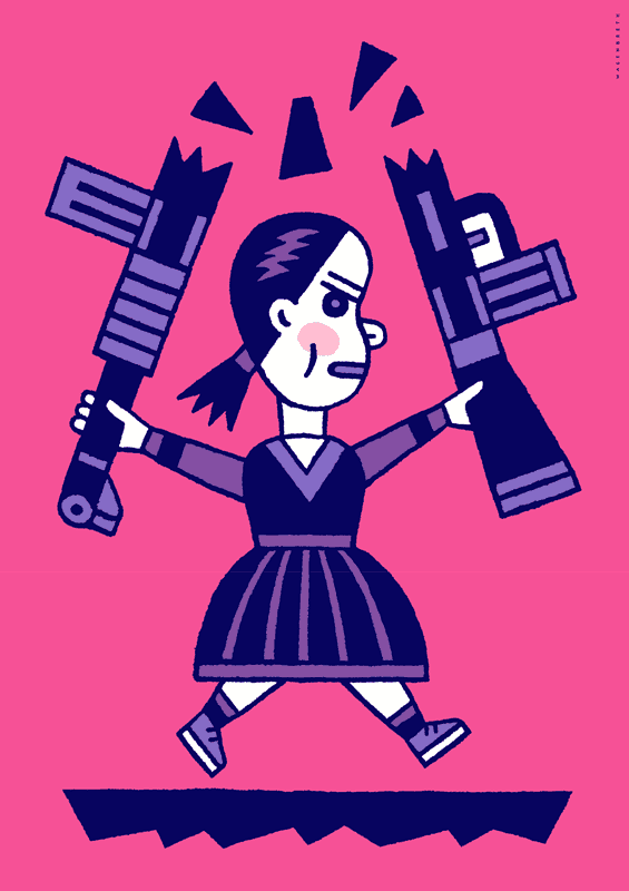 Черты, которые позволяют узнать автора иллюстрации: яркие, «выкрученные» до максимальной насыщенности цвета; графичая, четкая линия; геометричные уплощенные фигуры; сюжетная насыщенность и особый юмор, граничащий с реальностью. В ходе исследования я рассматриваю каждую из этих черт, глядя на разные его работы — от журнальных иллюстраций до постеров и книг.