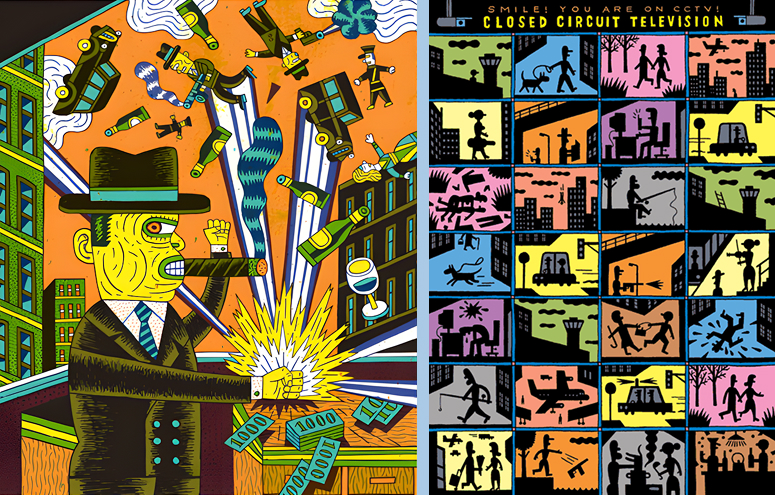 Иллюстрации к книге «Honky Zombie Tonk: Синие призраки Орлеана», 2013 // Плакат «Улыбнитесь» Вы в камере видеонаблюдения», 2009 // «Большая мышеловка», Альфред Лихтенштейн // «Моя улица», 2003