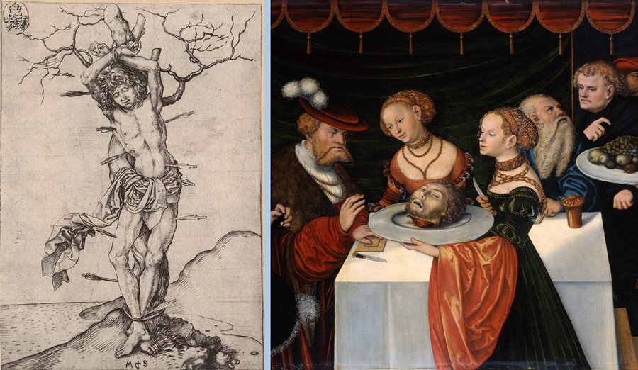 «Святой Себастьян», Мартин Шонгауэр, вторая половина XV века // «Саломея с головой Иоанна Крестителя за столом Ирода», Лукас Кранах Младший, 1537 // Автопортреты, Герхард Вьенковский, XX век