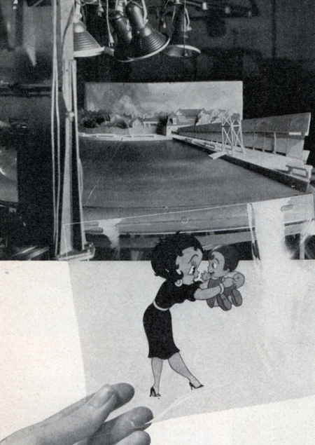 Дэйв Флейшер (слева) и оператор снимают сцену с живыми актёрами, которая будет использована при ротоскопировании соответствующего изображения справа из фильма «Mr. Bug Goes to Town»