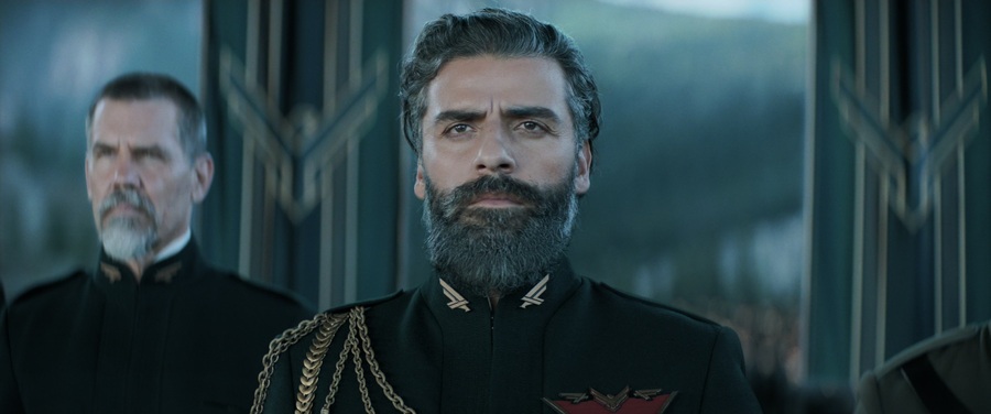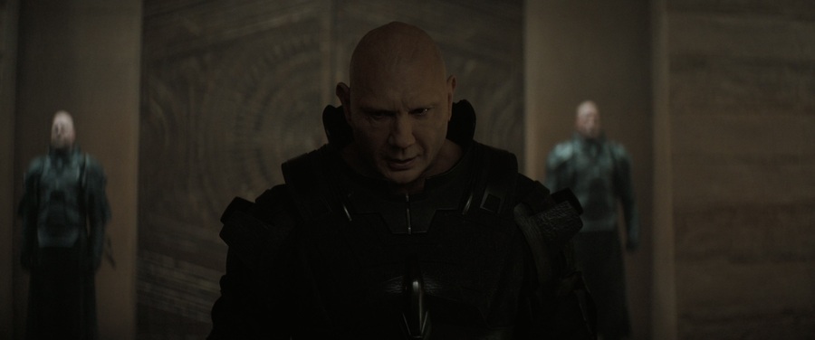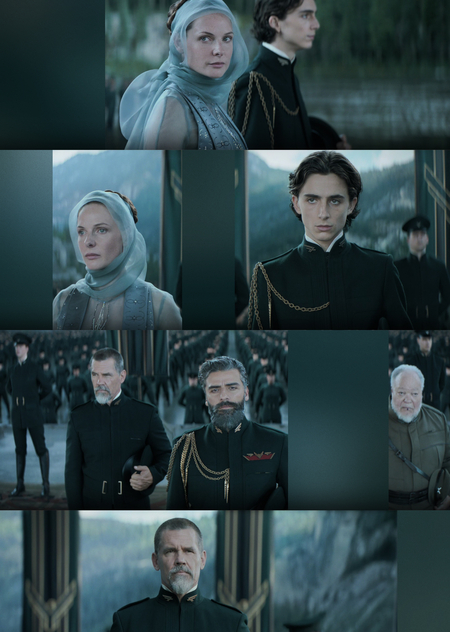 Военные мундиры выполнены из плотного тёмно-зелёного сукна, напоминающего шерстяные ткани средневековых рыцарей, но с современной обработкой. Пол Атрейдес носит одежду из натуральных материалов, подчёркивающих его связь с природой и переходное состояние между мирами: текстурированные льняные и хлопковые ткани создают ощущение мягкости и уязвимости. Серые доспехи воинов Атрейдесов сочетают черты брутализма, оригами и супергеройских костюмов, при этом сохраняя отсылки к средневековым рыцарским доспехам.