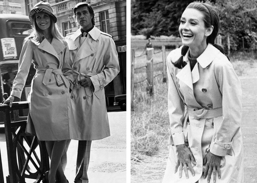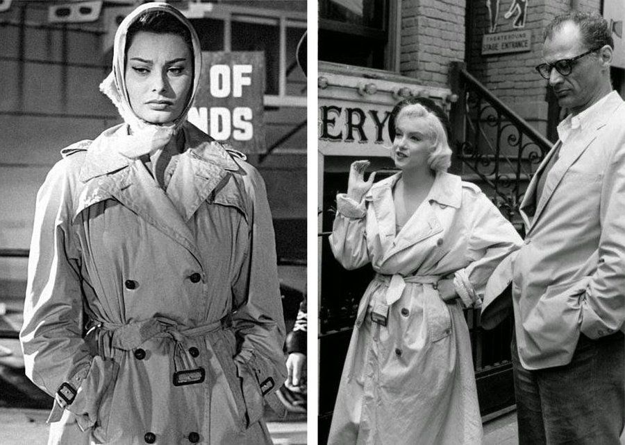 Лорен Хаттон в тренчкоте Burberry // Одри Хепберн в тренчкоте Burberry // Софи Лорен в фильме «Ключ», 1958 год // Мерлин Монро в фильме «Let’s Make Love», 1960 год