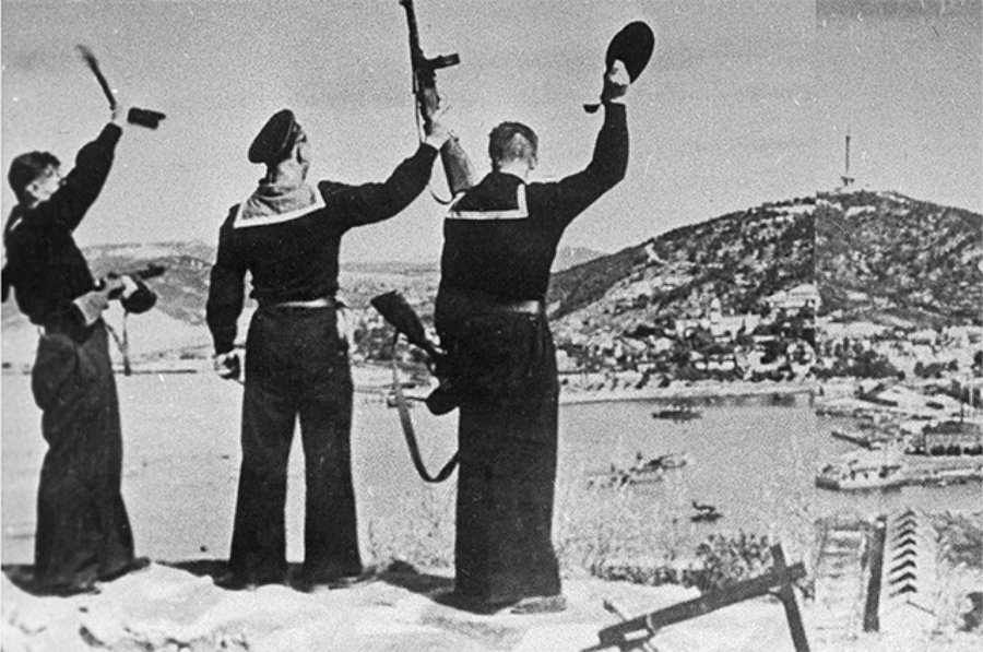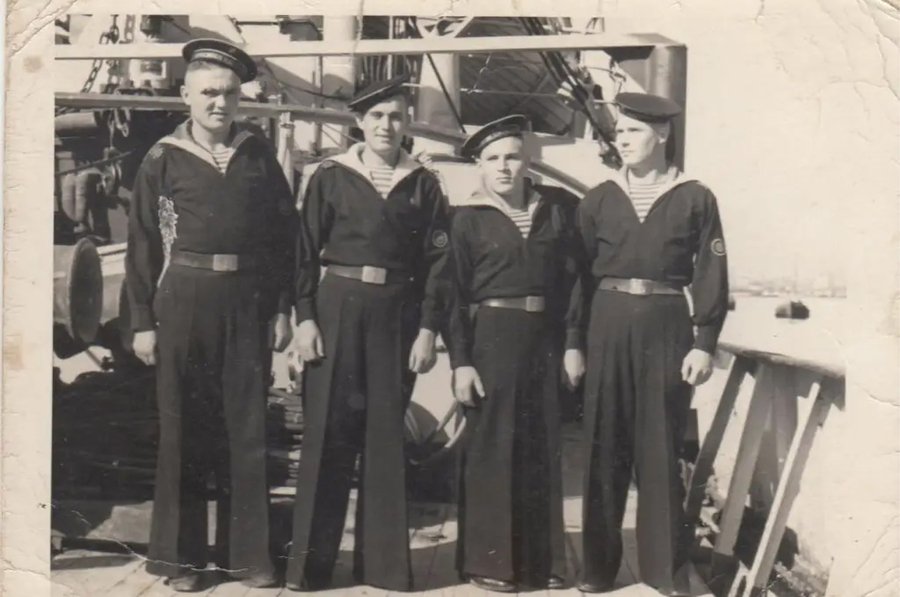 Штанины-клеш (от французского cloche — «колокол» или «труба») позволяли легко и беспрепятственно закатывать брюки до колен, чтобы не испачкать их при мытье палубы // Моряки Тихоокеанского флота