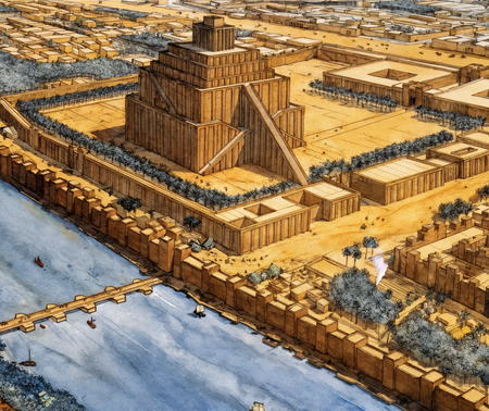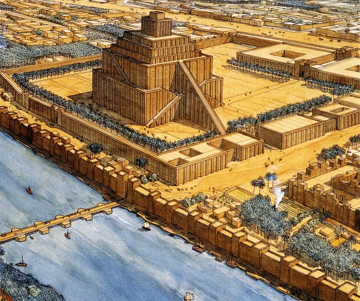 В центре древнего Вавилона возвышался еще более монументальнее и сложнее архитектурной структурой зиккурат Этеменанки. Это семиярусная башня с квадратным основанием и высотой до 90 метров, символизирующая «дом основания Неба и Земли» [4]