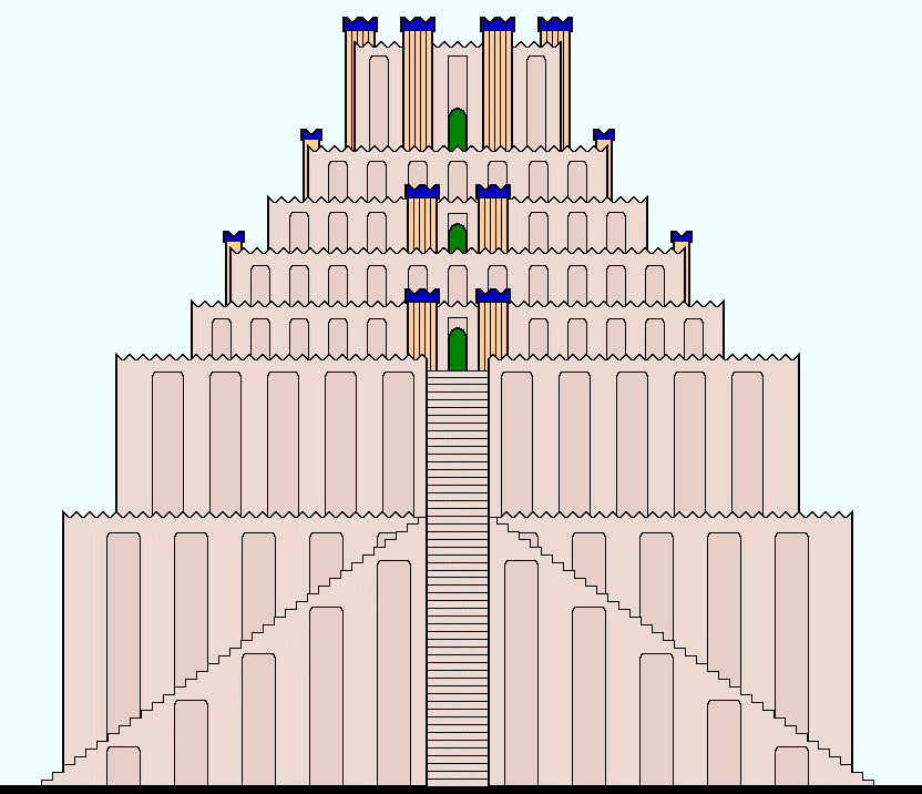 1. Стена зиккурата «плачущими глазами» 2. Лестницы зиккурата 3. зиккурат вид спереди