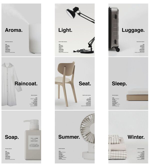 В плакатах бренда объединяются несколько визуальных концепций. Так в первой серии плакатов почти отсутствует цвет, много негативного пространства, есть асимметрия композиции и простота изображений. Здесь объединяются концепции ма и ваби-саби.