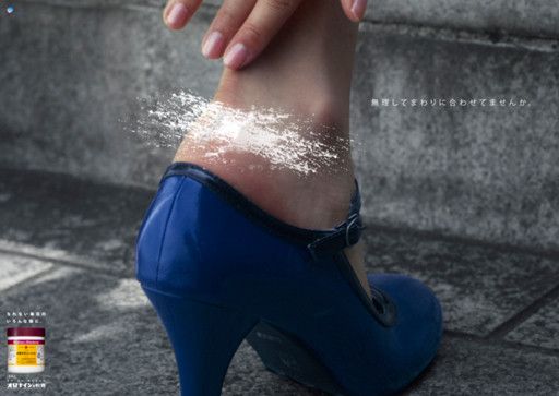 Ниже идут несколько примеров рекламы уходовой косметики. На обоих сериях плакатов используется фотостиль. Через дефекты и белые пятна на фото показаны проблемные или травмированные зоны. Продукт должен окрасить белые пятна, тем самым решив проблему клиента. На этих плакатах передана концепция ваби-саби.