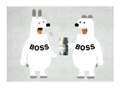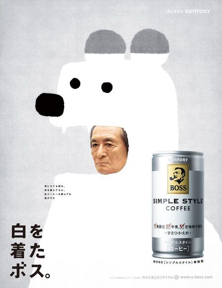 Реклама компании Suntory больше действует через эмоции. Плакаты про кофе используют карикатурный кавайи образ. Костюм босса не выглядит милым, он скорее передает состояние после полного рабочего дня. В этих плакатах появляется чувство, что тебя понимают и готовы поддержать. Здесь есть концепции ма, ваби-саби и каваий.