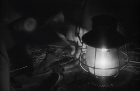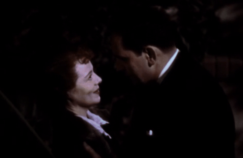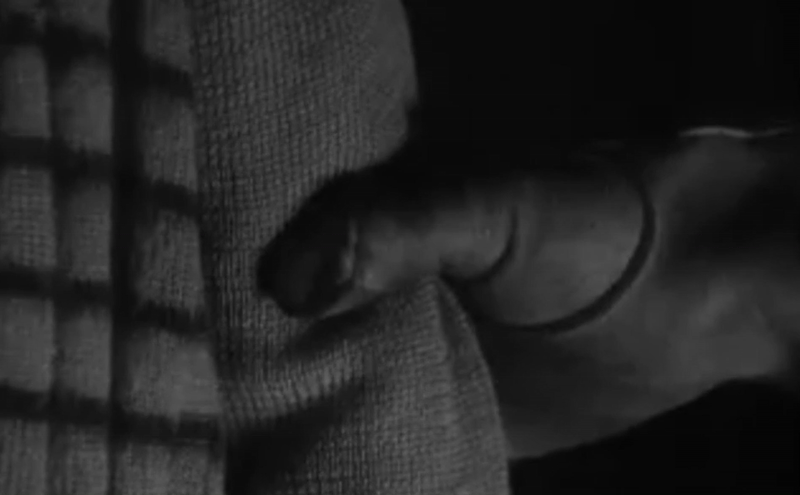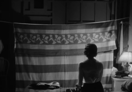 Капра строит композицию кадра так, что ткань делит пространство пополам, но при этом объединяет персонажей: их голоса звучат в темноте, ритм дыхания совпадает, а невидимое напряжение становится ощутимым. Здесь расстояние превращается в метафору запрета, который рождает новую форму страсти — не в действии, а в удержании.