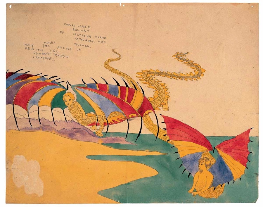 Генри Дарджер, «Гигантская роверин с детёнышами. Все ядовиты. Все острова вселенских морей и океанов. Также в Кальверине, Анджелинии и Аббиэннии», ок. 1950 [26]